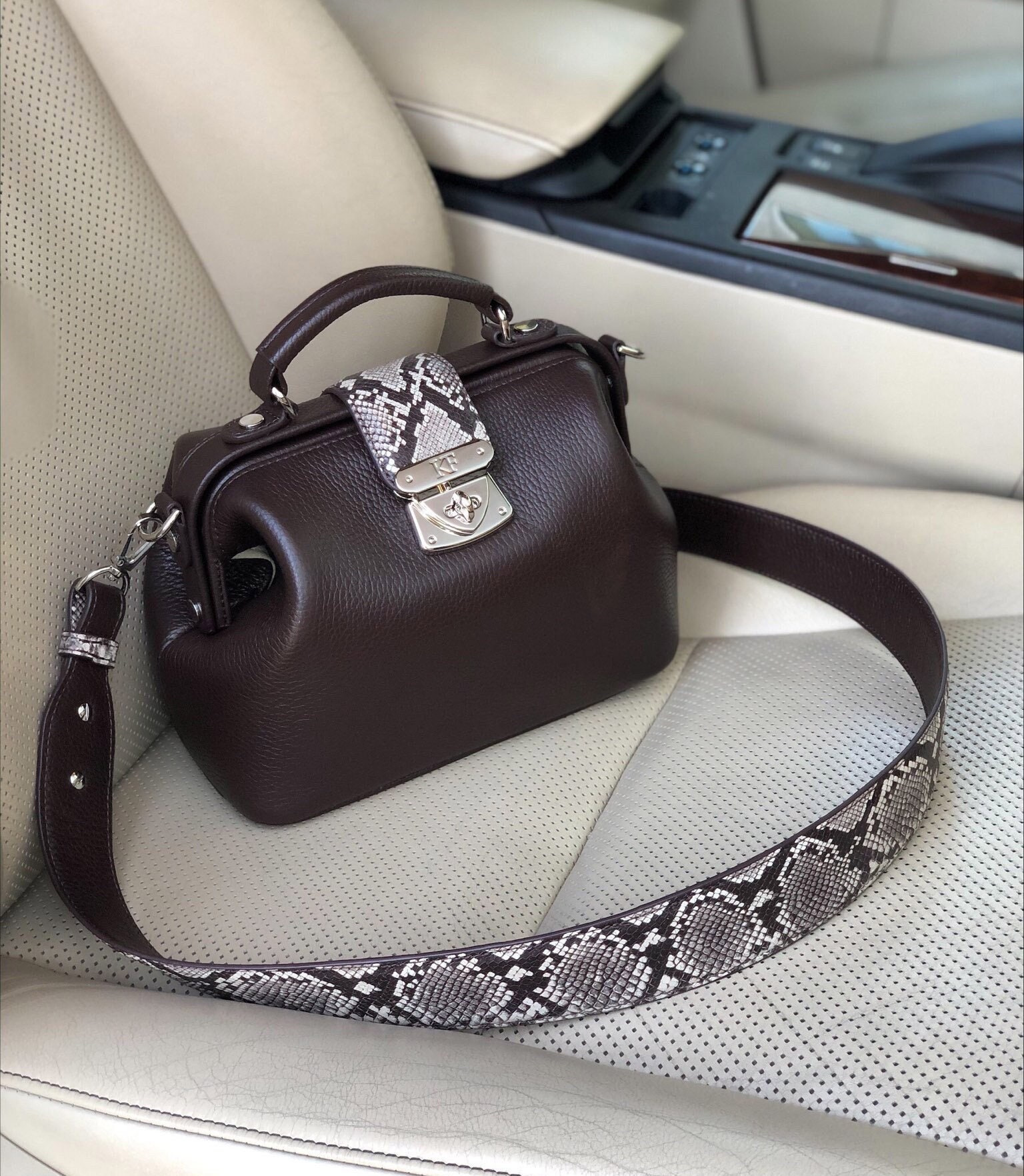 Women's leather doctor bag made of genuine leather, hardware with galvanic coating and microfiber lining. The internal space of a bag is equipped with one spacious compartment, one patch-pocket and one zipper pocket. The bag is closed with a clasp. The kit also includes a storage bag.