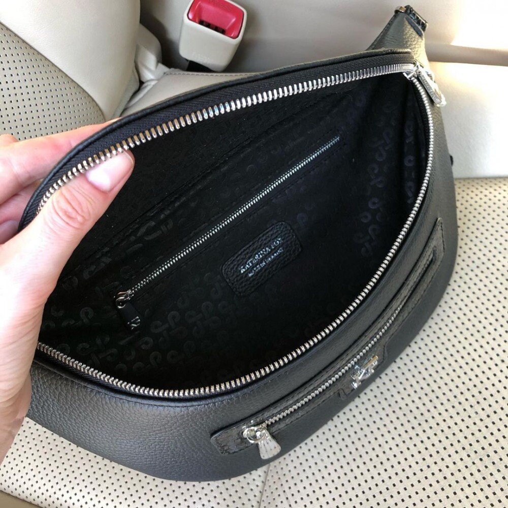 White genuine leather woman banana bag from Ukrainian designer Katerina Fox. Fashionable and elegant modern bag KF for bright girls and women. This bag is able to attract attention and highlight your exquisite taste. Inside the bag is one large compartment and a convenient zippered pocket for small items that closes the bag on the zipper.